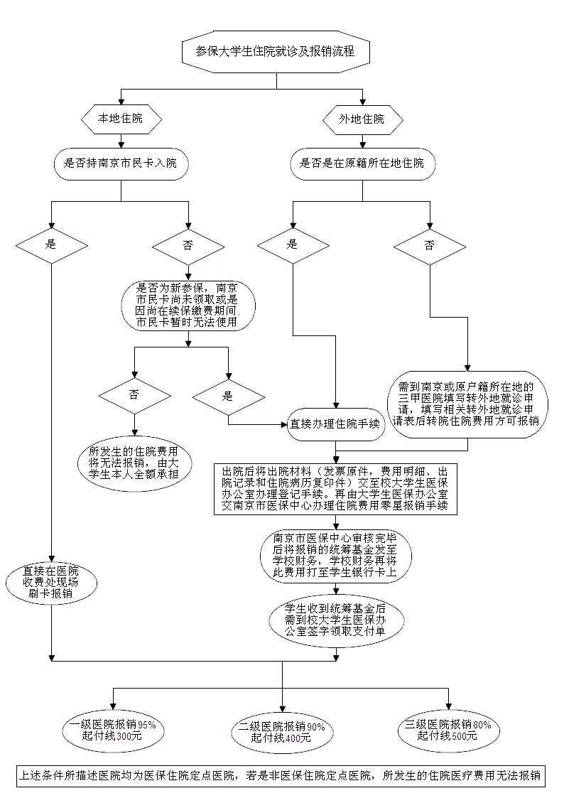 各学院: 为做好大学生暑假住院费用的报销工作,根据南京市社保中心相关规定,请各学院通知2016-2017学年参加大学生医保的学生中有在暑假假期间在外地住院的,尽快将住院报销材料递交至校大学生医保办公室(老行政楼203室),由校大学生医保办到南京市社保中心统一办理零星报销手续。 住院材料包括住院发票、住院病历、出院小结、费用清单(其中住院发票需为原件,其他可为复印件),在非原户籍所在地住院的还需提供转外地就医的申请,办理时请带上本人相关证件。 相关说明: 1、已有南京市民卡的参保大学生在南京市医保定点医院住院时需现场刷卡结算报销。未刷卡结算的费用南京市社保中心不予报销。 2、相关参保大学生住院就诊及报销流程见附件流程图,请参保大学生严格按照流程操作,以免发生的住院费用无法报销。 3、因外地住院材料上交南京社保中心是按零星报销流程办理,需要排队进行人工审核,故审核周期较长,请递交材料的同学耐心等待审核下款。 综合门诊部 2017年09月03日 参保大学生住院就诊及报销流程.jpg
