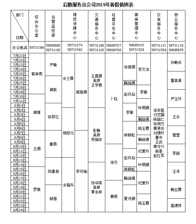 后勤服务总公司2019年暑假值班表