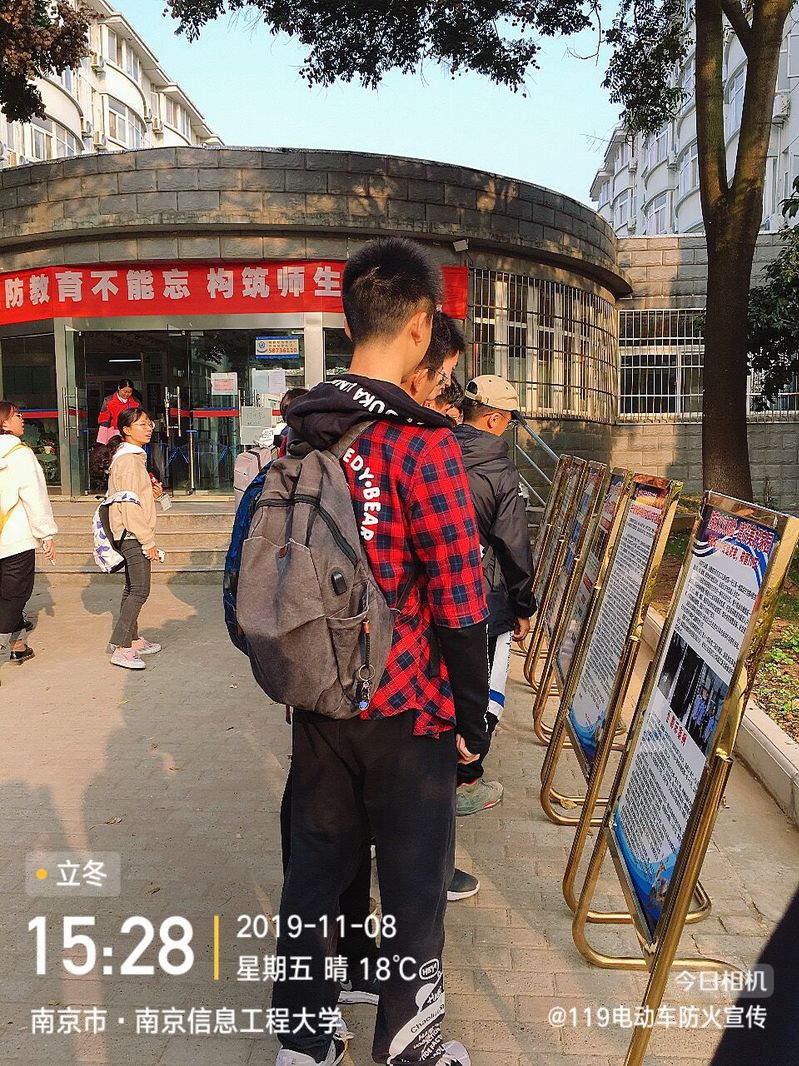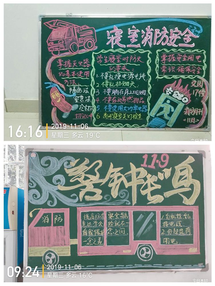 连日来,宿管中心开展了一系列“119”消防安全知识宣传活动,活动共分四种形式:一是制作电动车防火安全的宣传海报,在各宿舍楼门厅前巡展;二是在每个宿舍门楼厅制作有关消防知识的黑板报;三是制作消防宣传横幅,挂于宿舍楼门厅前;四是宿舍管理员将电瓶车室内、楼道充电引发火灾的视频、遇到火灾的逃生法则等发到学生群里,教育引导学生如何防范火灾和逃生自救。