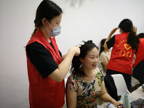 在五一国际劳动节到来之际,为了向守护自己的宿管阿姨们表达敬意,龙山书院的一群学子们通过为阿姨们进行形象设计、拍写真的方式,帮助阿姨们寻找自己的芳华岁月,寻找那些曾经遗失的美好,用精致的妆容和最美的镜头,让时光惊艳。部分阿姨代表成为此次形象设计的主角,从服装搭配、妆面设计到发型设计,每一个细节,无不透露出学生们的用心。修眉、打底、抹粉……一双双巧手,让一张张精致的妆容新鲜出炉。她们是中心的一线劳动者,工作多年不施粉黛,从未精心打扮过,看到妆后的自己,纷纷感叹,原来自己也很美!