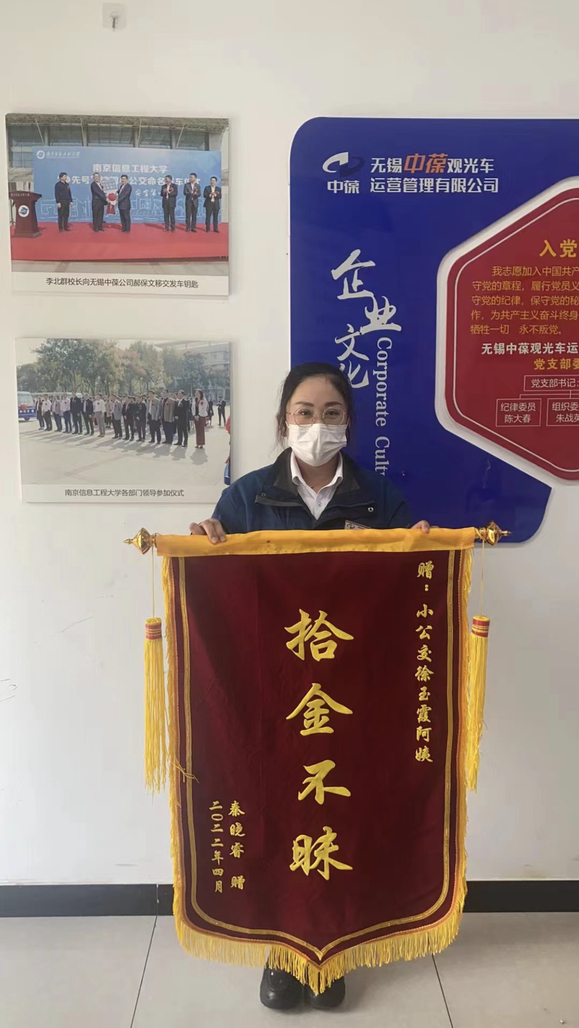 她,徐玉霞,校园小公交15号车驾驶员。当天车辆进入终点站清查时,发现一部遗失的电脑。她急人所急,想人所想,千方百计寻找失主,并不辞辛苦地联系到失主本人秦同学,将贵重的电脑,完好无损交还同学。同学看到失而复得电脑十分激动,深深地被阿姨拾金不昧的精神所感动。