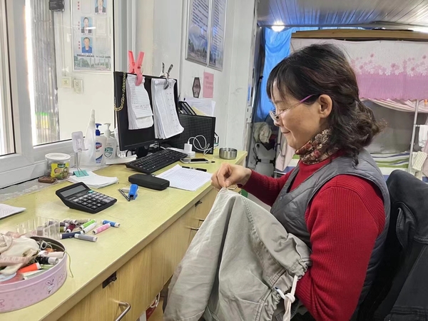 她,朱俊英,文园18栋学生公寓值班员。该公寓住有将近1000个男生,男生天性好动,衣服炸开磨破是常有的事,修补对于他们比登天还难。每当同学们发现衣服、背包等张嘴开线,就直接到门厅找值班阿姨帮忙,朱阿姨针线活儿顶呱呱,成了同学们的专属的缝补大师。无论什么时候,学生有困难,都是有求必应。她戴上老花镜,拿出针线盒,一针一线密密缝,帮助同学解燃眉之急。