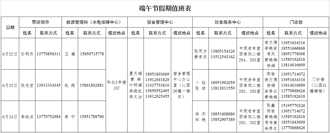 总务处(后勤服务总公司)端午节假期值班表