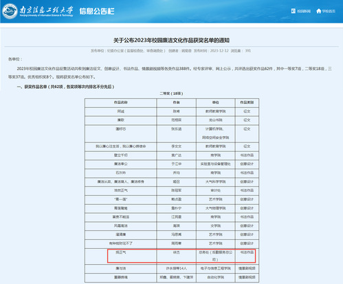 为贯彻落实党的二十大精神、中共中央《关于加强新时代廉洁文化建设的意见》,落实教育部及教育厅关于举办高校廉洁教育系列活动的要求,纪委办公室、党委宣传部、党委教师工作部、校团委联合开展以“廉洁润初心 铸魂担使命”为主题的第十二届校园廉洁教育系列活动,总务处(后勤服务总公司)积极参与活动,选送饮食服务中心副主任徐杰同志的书法作品《扬正气》参与评审并荣获二等奖。